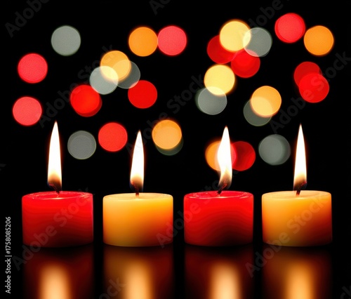 Four lit candles with colorful bokeh lights in the background create a warm festive holiday scene