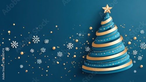 Blue Christmas tree with golden ribbons and star topper in a festive holiday scene