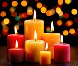 Colorful candle arrangement with warm glow and festive lights against a dark background