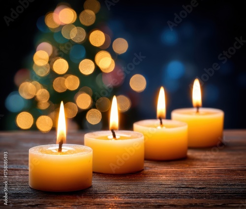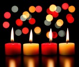 Four lit candles with colorful bokeh lights in the background create a warm festive holiday scene