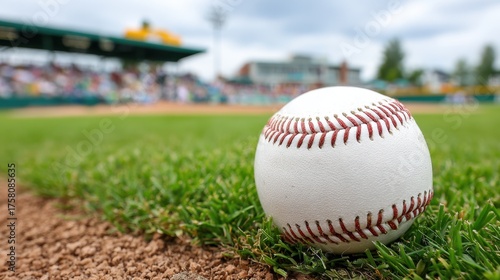 Close-up view of a soccer ball on lush green grass inside a stadium at night