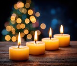 Soft candlelight on a wooden surface with bokeh Christmas lights in the background