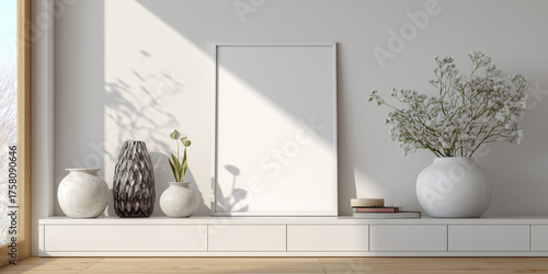 Minimalistic home decor with blank frame and flower vase on a wooden shelf