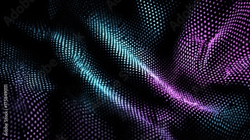 Wavy blue halftone pattern creating a flowing digital landscape with dotted grid on a blue background