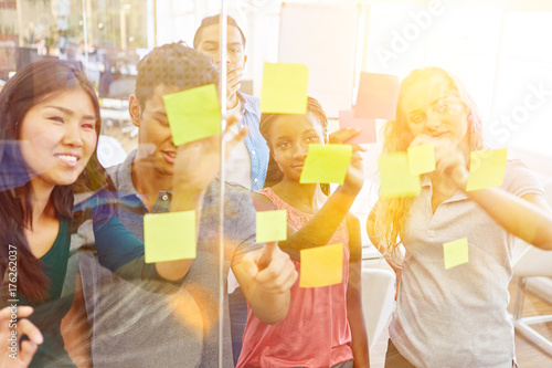 Geschäftsleute beim Brainstorming mit Haftnotizen
