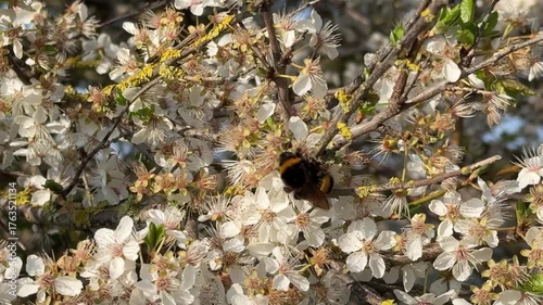 Bumblebee pollinating white cherry tree blossoms on a tree branch in spring.