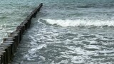Baltic Sea waves crashing against wooden groins on a cloudy day near Graal-Müritz, Germany.