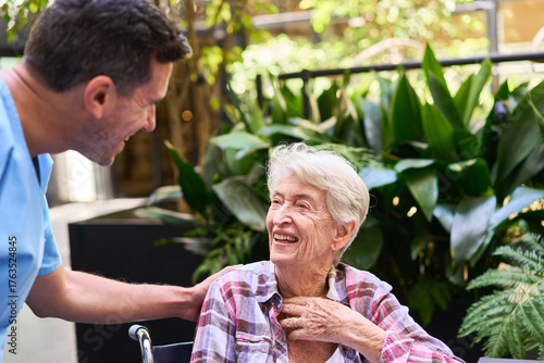 Senior caregiver assisting elderly woman in wheelchair in a garden setting