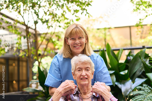 Smiling elderly woman with caregiver enjoying time in a lush garden