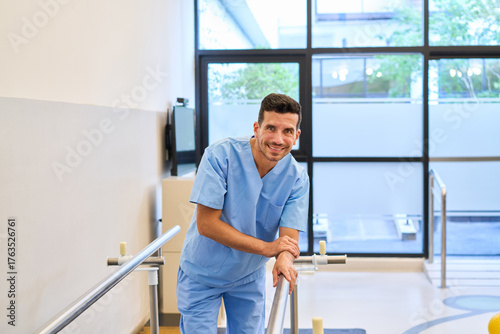 Healthcare professional assisting in physical rehabilitation therapy in a medical facility