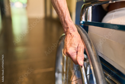 Close up of senior hand pushing wheelchair indoors in bright sunlight