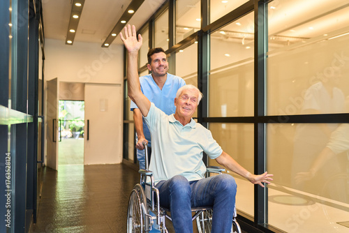 Caregiver assisting happy senior in wheelchair during joyful rehabilitation session