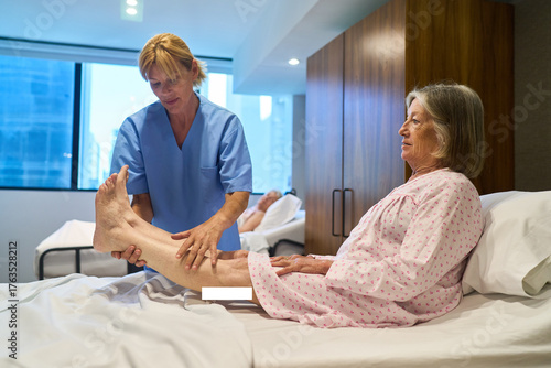 Nurse assisting senior woman in a rehabilitation facility during recovery