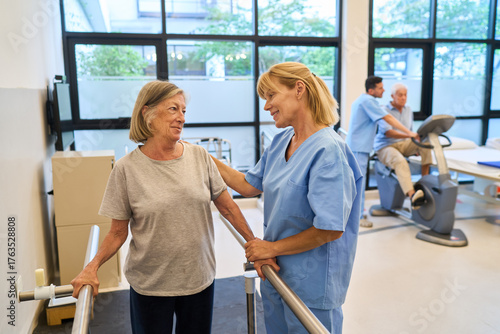 Nurse assisting senior woman during physical therapy session in rehabilitation center