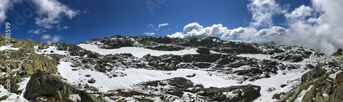 Panoramic mountain view with rocky terrain and snow under a bright sky