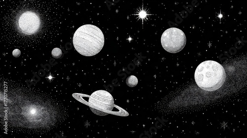 Grainy black and white night sky with planets, rings, and stars in a cosmic scene