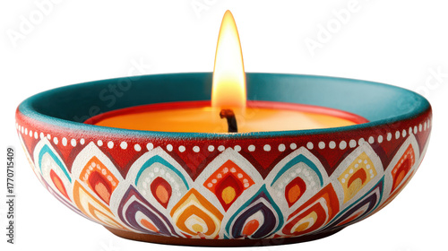 PNG Lit diya oil lamp in a decorative colorful bowl with a bright flame for celebration