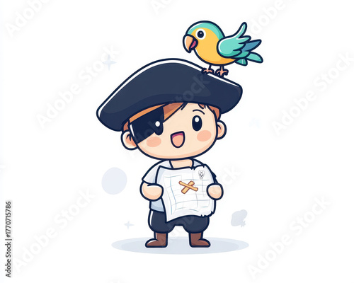Cute pirate adventurer with a parrot companion holding a treasure map