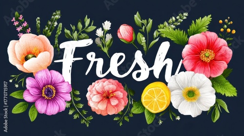Colorful floral composition with fresh typography on dark background