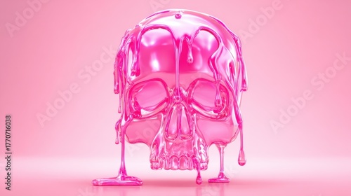 Pink dripping skull sculpture with neon glow, glossy liquid texture, bold visual art