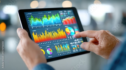 Professional analyzes dynamic data on a tablet with charts and dashboards on screen