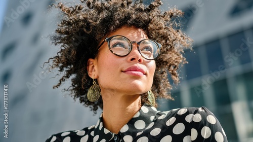 Young African American businesswoman in polka dot blouse with glasses outdoors in city setting