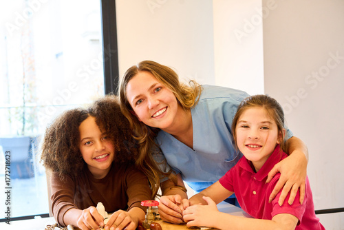 Children with therapist in pediatric physiotherapy session, playing with educational toy for motor skills training, rehabilitation exercises, pediatric rehab center