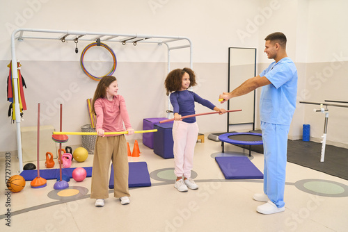 Pediatric physical therapist assisting children with rehabilitation exercises in a clinic, balance training, motor skills development, kids physiotherapy, rehabilitation center