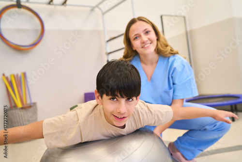 Boy doing rehabilitation exercises on a fitness ball with a therapist in a pediatric rehab center, motor skill training and balance exercises for children, physical therapy session