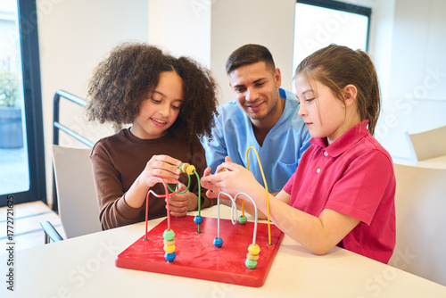 Children with therapist in pediatric physiotherapy session, playing with educational toy for motor skills training, rehabilitation exercises, pediatric rehab center