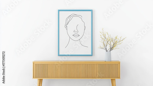Minimalist decorative console with framed art and branch arrangement on white wall