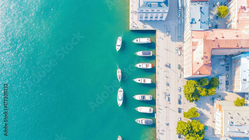 Aerial view of urban coastline with docked boats and teal water