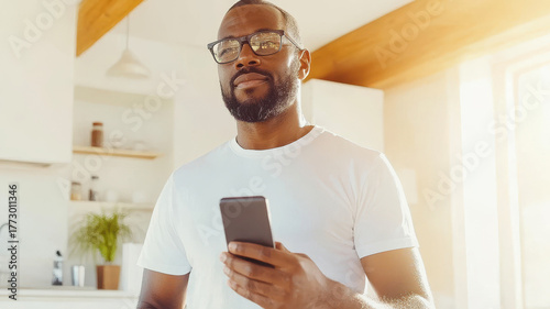 Smiling man enjoying coffee while using his smartphone near a bright doorway