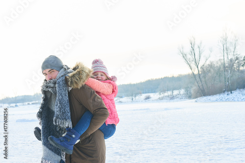 Familie hat Spaß beim Schlitten fahren und rodeln