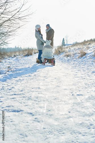 Familie hat Spaß beim Schlitten fahren und rodeln