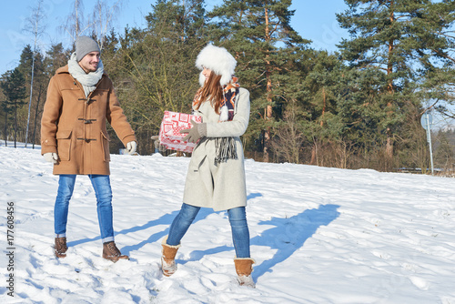 Paar mit einem Geschenk im Winter