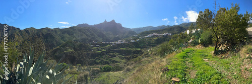 Panoramic view of scenic mountain path under vibrant sky and lush greenery