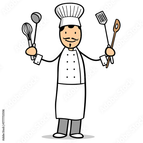 Cartoon Koch mit Kochmütze hält Küchenhelfer
