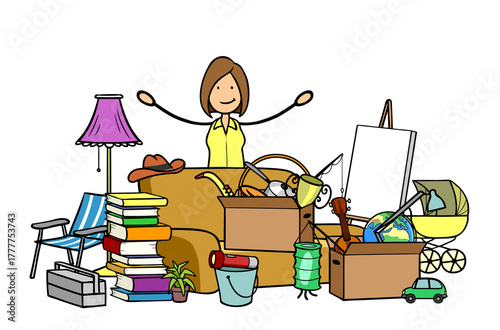Frau steht hinter Sperrmüll Hausrat bei Entrümpelung vor Umzug