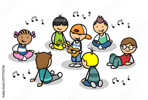 Cartoon Kind spielt Gitarre vor Gruppe Kita Kinder im Morgenkreis