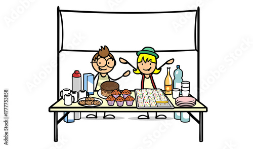 Zwei Cartoon Kinder an Stand vom Kuchenbasar mit leerem Banner