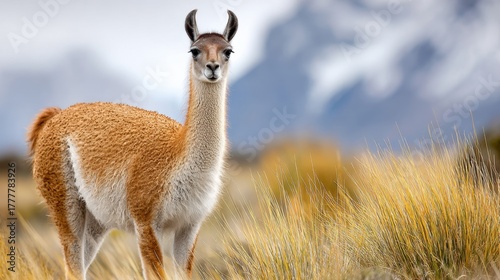 Guanaco portrait in natural habitat, wildlife photography in Patagonia, South America, animal in nature, outdoor scene, wildlife animal, mammal, landscape, wild animal