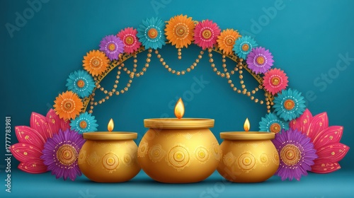 Golden Dhanteras Lamps with Floral Arch and Festive Decor for Diwali Celebration