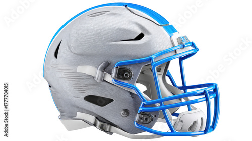 PNG gray football helmet with blue faceguard and stripes, modern protective gear for sports and fitness