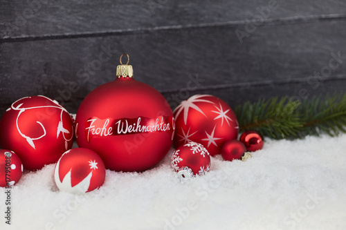 Frohe Weihnachten als Text auf Weihnachtskugel