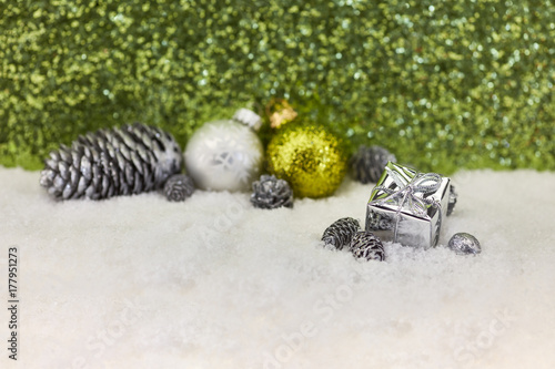 Weihnachtskugel und Geschenk auf Schnee