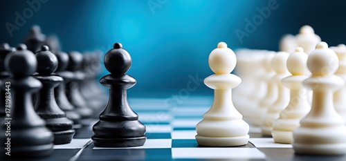 Chess Pawns Off On A Chessboard Strategy And Competition Concept Blue Background