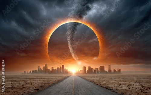 Apocalyptic Cityscape With Fiery Ring And Stormy Sky Road Leading To Destruction End Of The World Concept
