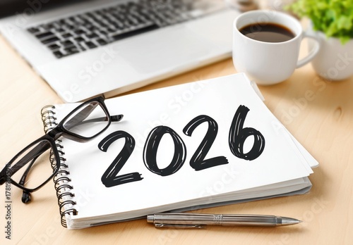 year planning concept hands holding notebook with future date coffee and laptop on white desk top view