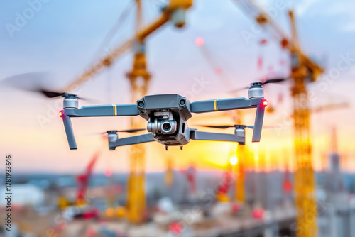 Drone Flying Over Construction Site At Sunset Aerial Photography And Inspection Modern Technology For Building